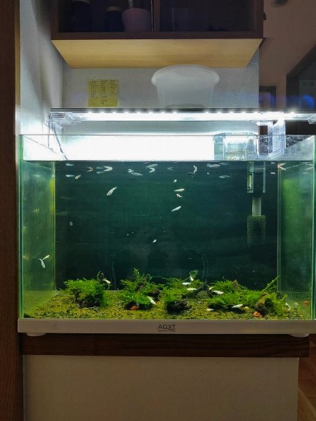 ただ1個所だけ、エアコンが引っかかりました。ちょっと邪魔。かといってエアコンをカットするわけにもいかず。そこで思いついたのが、同じ25㎝幅の水槽でありながら縦が12㎝のレグラスを配置して万事解決。まるでオーダー水槽のように、違和感もなく収まっています。