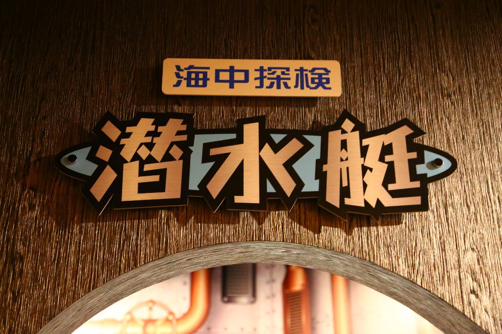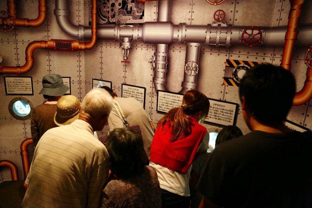 水槽を潜水艦に見立てた、遊び心満載の展示です。