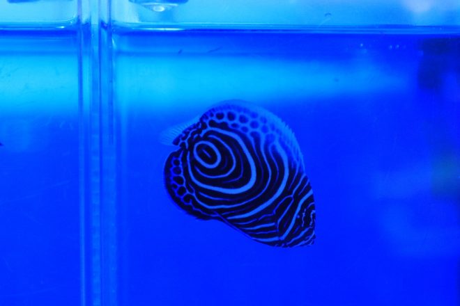 渦巻き模様が可愛いタシジマキンチャクダイの幼魚。「それがいいと仰るお客さんがいましてね。成魚になったら幼魚と交換しにこられるんですよ(笑)」。へー、そんなこだわりが。