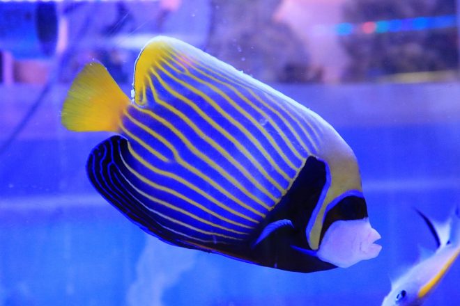 こちらが成魚のタテジマキンチャクダイ。水族館やアクアイベントで見た人も多いと思いますが、渦巻き模様の幼魚と同じ種類だとは思えないほどカラフル。個人的にはこちらのほうがビューテホーだと思うのですが、みんなと同じなのはノーというのが海水魚ユーザーのポテンシャルなのかも知れません。