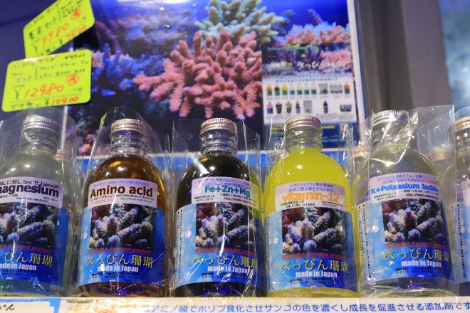 ん?これは?商品名は「べっぴん珊瑚」。ひとことでいえば、アミノ酸を使ってサンゴを色鮮やかにし、そして成長を促進させるというサンゴ専用の添加剤。純国産でありながら、企業が営業ベースで製造しているわけではなく、つくったのは大阪在住の有名ブロガーさん。へー、これは初耳です。