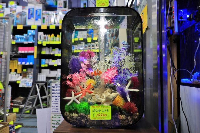 結構大きいサイズのわりにはよく売れているという、バイオーブのブランドで知られるアクリル大型水槽「ライブ」。ライトとフィルターの2つのパーツを1つのコンセントでまかなえるように設計。専門店ならではの品揃えです。