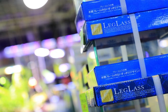 KOTOBUKIのロータイプ水槽レグラスも。「初心者のお客さんがメダカを飼育するにはぴったりなので、極力在庫を切らさないようにしています」と藤原店長。ショップ自体、どちらかというと中・上級者がターゲットかと思いきや、「あまりそういう区別はしていません」と意外な答が。