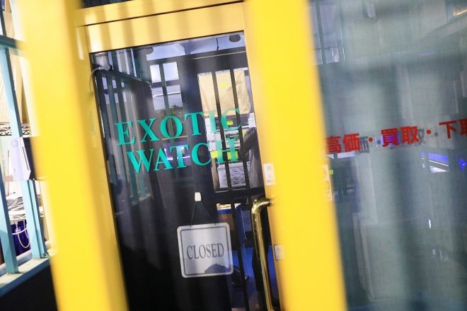 まるで鉄格子のような構造のさらに奥を見ると、え?エキゾチックウォッチって?よくみると、「高価・買取・下取」って。う~ん、ますますアヤしい(笑)