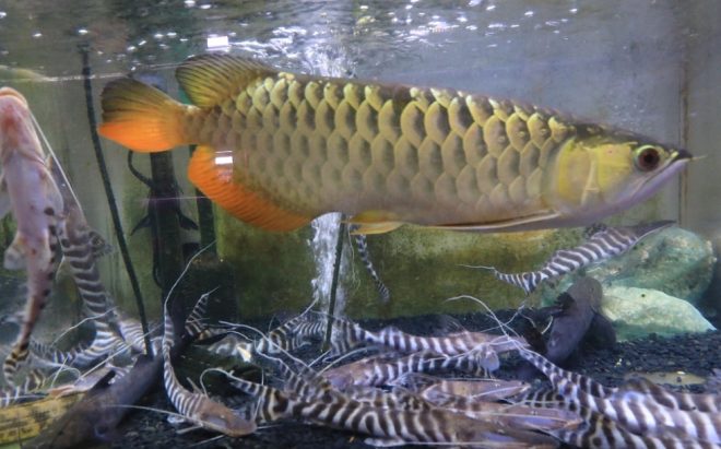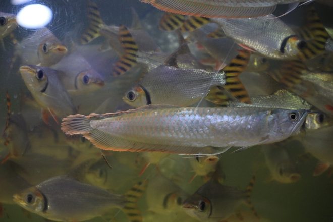 コーナーをじっくり見ていると、多くの魚がワラワラとたくさん泳いでいる水槽があります。ここではオリノコシルバーアロワナのワイルドやアルビノセルフィンPなどが混泳。