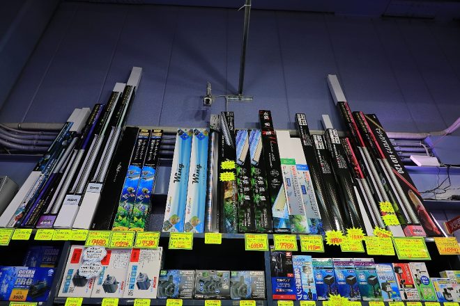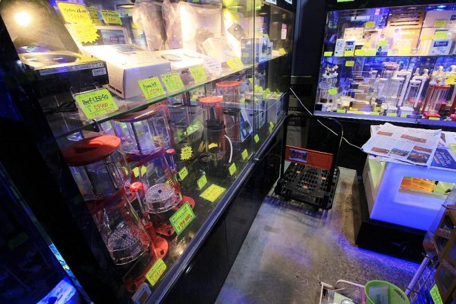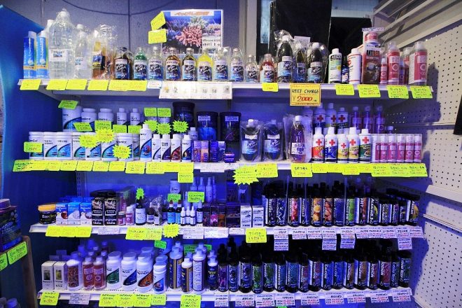 あまりほかではお目にかかったことのない各種用品も。しかも用品にしては結構高そう(笑)。「海水魚ファンには、生体や水槽レイアウトにこだわりのある人が多いんです。たとえば、飼っている生体が死んだらまた同じ種類のものにしたり、用品にはとことんお金をかける人が多かったりで、そんなこだわりに応えられる体制を整備しておかないといけませんから」と藤原店長。海水魚を扱うのをやめようとは一度も思わなかったのも、そうした固定客が少なくなかったからでしょう。