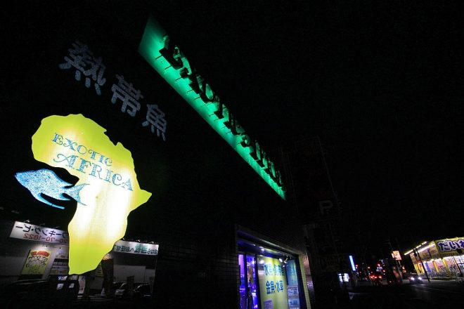 夜の帳が下りて、すっかりエキゾチックな雰囲気に。闇夜に浮かび上がるアフリカ大陸が印象的です。これからどうすればアクア人口が増えていくのでしょうか。その先にある課題は、まさにアフリカ大陸のごとく果てしなく。店名とアフリカとはまったく関係ないのに(笑)