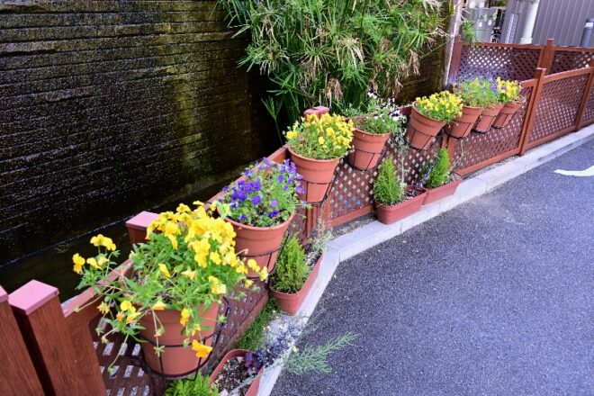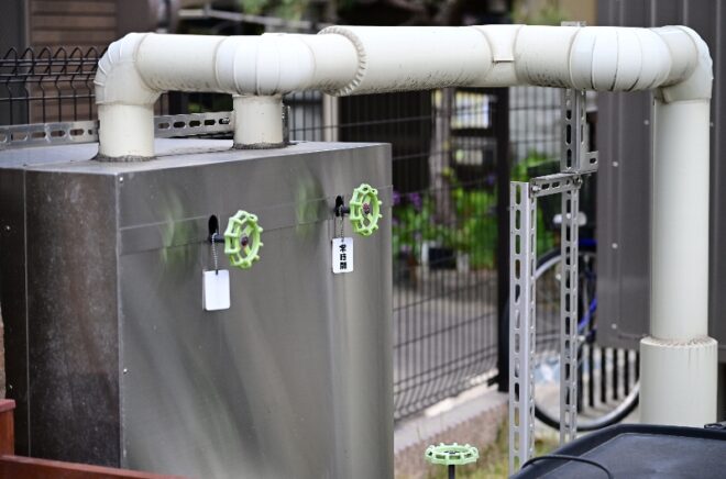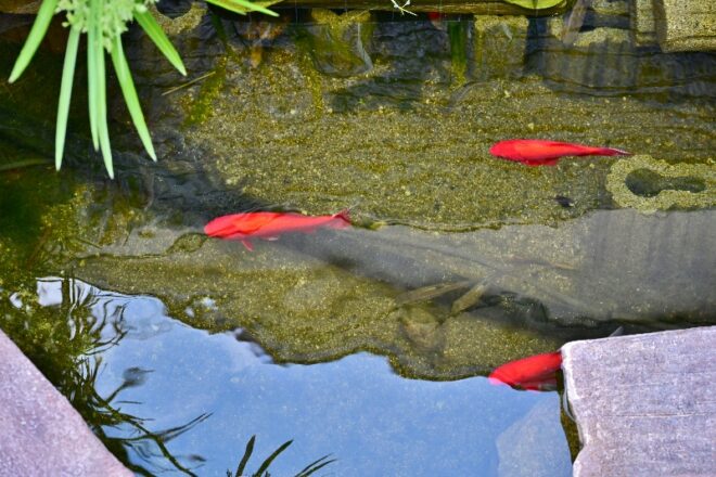 置物のあるスペースとは間逆の場所にあるのが、駐車場の片隅にある専用池。お~、水槽だけじゃなく池もあったとは。「でも、気付かない人のほうが多いと思いますよ(笑)」(川﨑さん)。それはもったいない。