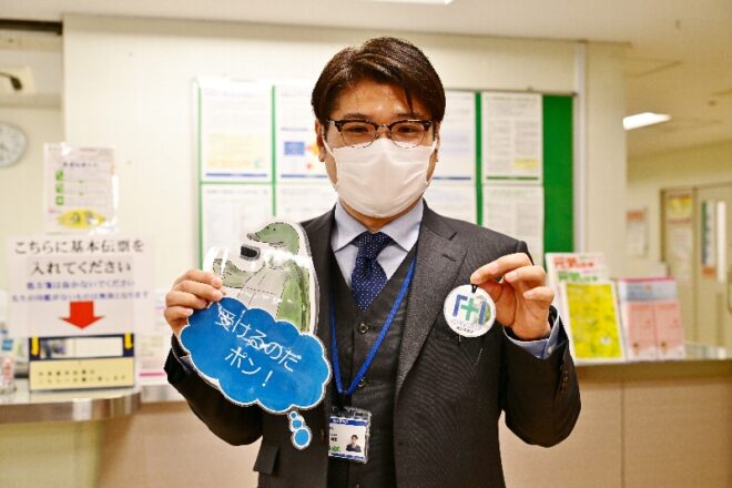 取材中、たまたま通りかかったポンちゃんの生みの親・情報管理課課長の田中さん。「ポンちゃんをたまたま遊び半分で描いていたら、みなさんがおお~ええやないか!と絶賛してくださいまして(笑)」。当初は今とまったく違ったポンちゃんだったそうですが、その後アップデート。何気ない落書きが、今や病院に欠かせないキャラクターに成長したというわけです。