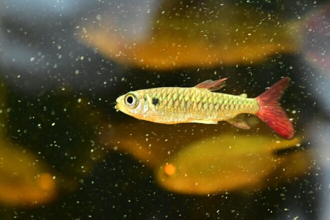 流木から出たアクで自然に黒くなってブラックウォーター状態。見るからに野性的。ちなみにこの水槽にいるワイルド系のピンクテールカラシンはスポテッドとイエローで、比較的入手しやすい個体ですが、今は純粋なピンクテールカラシンの入手がかなり困難なのだとか。たまに見つけたとしても、1匹数万円はするとのこと。「昔は買えたのになあ~」と理事長。