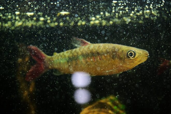 立派に成長した金魚がまるでコイのたたずまい。オイカワやヨシノボリもいます。