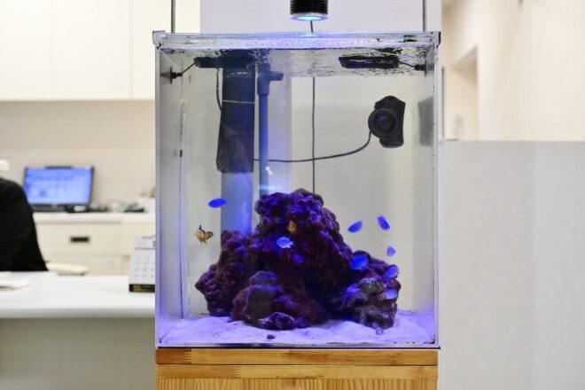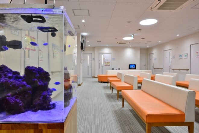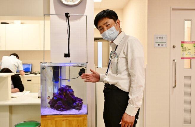 同科受付横には、院内唯一の海水魚水槽が。「ひとつくらい海水水槽が欲しいなあという意見があったので」。ルリスズメやカクレクマノミを飼育し、子どもでも見られるような低い位置に設えました。