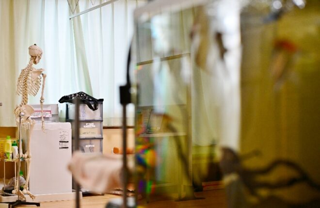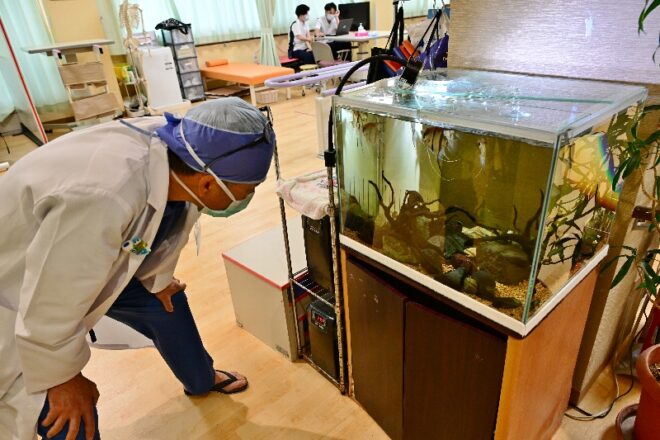 同じ病棟の3階にあるリハビリテーションセンターにも水槽が1個。「当初はタコを入れてたんです」(理事長)え、あのタコ?「リハビリには体の柔軟性が必要不可欠。柔軟性といえば、やっぱりタコでしょ(笑)」。理事長自らが率先して取り組んだ「オクト計画」は3年で断念。現在はエンゼルフィッシュがメインで、管理はリハビリのスタッフで行われています。