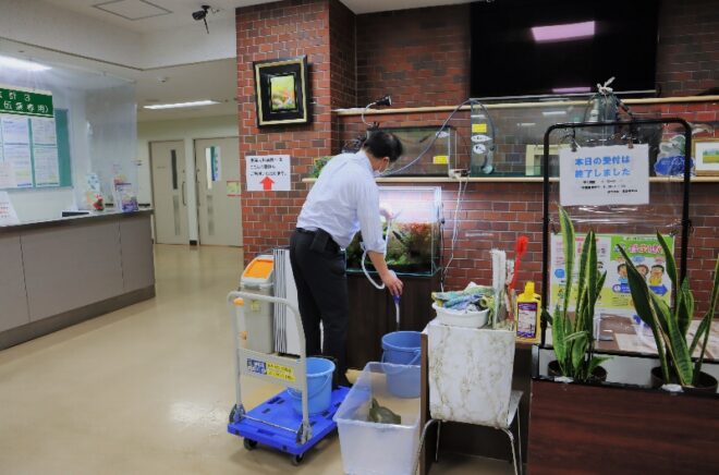 あー、この人さっきメンテしてた?これまた通りがかりの事務部副部長 地域連携・退院支援課課長の町田さん。週一のメンテでは、産婦人科の海水水槽を担当。普段は魚ではなく、人が相手。寝屋川市の将来を担う地域医療や福祉の連携に欠かせない、アクティブなスタッフです。