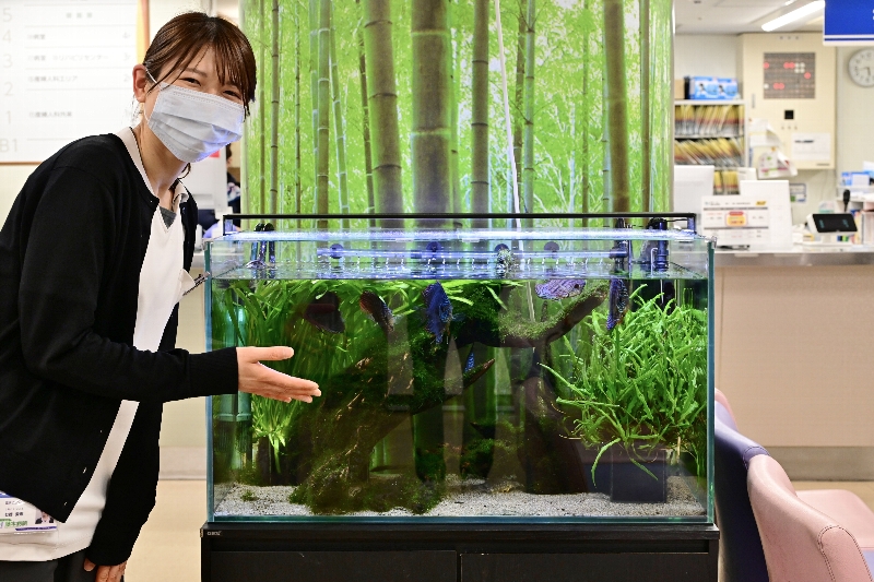 ロビー以外にも水槽が。4年前に新築リニューアルされた産婦人科の玄関に置かれた120㎝水槽。院内で一番大きい水槽です。