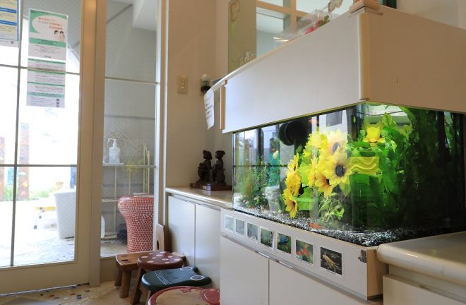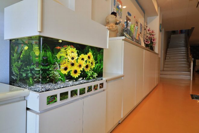 ひまわりをバックに、生まれたばかりのサンタクロースソードテールの赤ちゃんもいました。水槽を管理するメンテ会社によると、園側と相談してできるだけ子どもたちの目にとまりやすいよう目立つ魚をチョイスしているのだそう。「中には魚の名前を覚えている園児もいるんですよ」と園長代理の大西和美さん。毎日ただ漠然と水槽を眺めているだけではなく、興味があるからこその好奇心の賜物です。