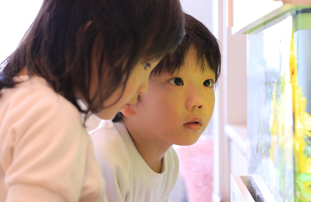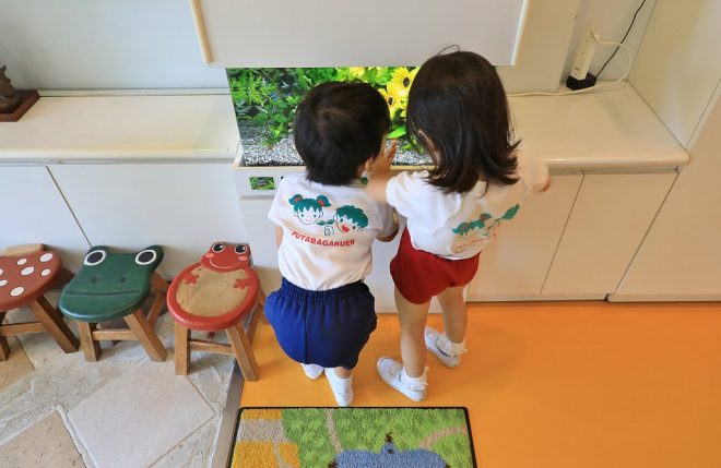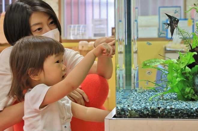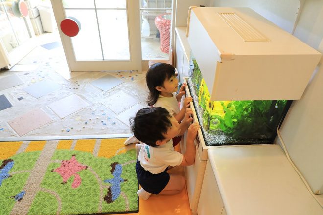 園児たちを楽しませているのは、お歌やお遊戯だけではありませんでした。そう、玄関に置かれた水槽が朝な夕なに園児たちとふれ合っているからです。毎日のように繰り広げられるほのぼのとしたシーン。水槽のあるエントランスでは、どんな日常が繰り広げられているのでしょうか。