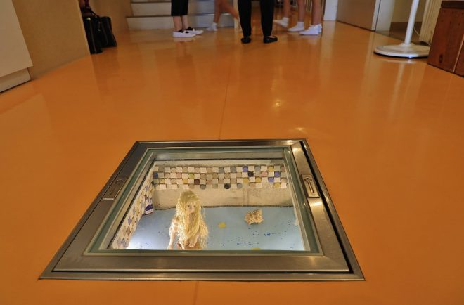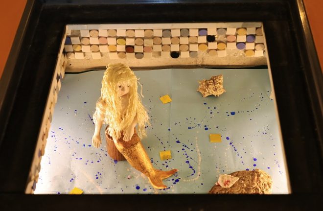 さらに近づいてみると、ドールや貝殻などが置かれたシュールな世界が広がっていました。収納という機能のない、いわば“床下アート”。小山さんたちの手によって、水槽同様に季節を意識した演出が施されていて、園児たちに人気があるそうです。水槽管理は無理でも、床下アートなら任せて!という、デザイン心のある小山さんの心意気なのかも知れません(笑)
