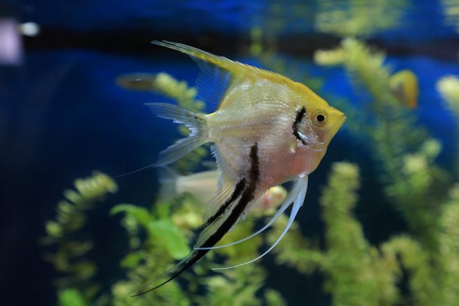 エンゼルフィッシュ(ミックス)は、もともと保育園の60㎝水槽にいたそうですが、ソードテールの子どもが生まれたことでこちらへ“移住”。これによって、ソードテールの小さな命も守られました。