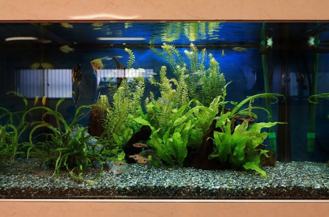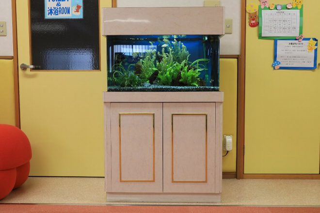 ここは地域子育て支援のための施設。水槽が置かれていたのは1階のスペース。しかもこちらは90㎝。この日は、さっきの水槽のように季節を意識したデコレーションは施されていませんでしたが、水草のみであしらった潤いのある水草水槽でした。