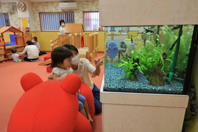 ゆっくりと水槽を通して生きものとふれあいこと。それは、自宅とは違う環境でお母さんにとっても子どもたちにとっても、大きな気分転換になることでしょう。水槽で泳ぐ魚たちは、そんな親子のストレス軽減にも一役買っています。