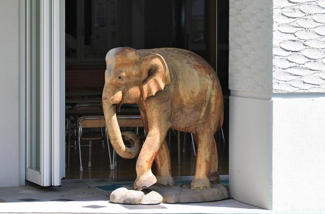ん?こんなところにゾウがいるゾウ~(笑)。これは初代副園長がずっと前に海外で購入してきたお土産なのだゾウ~♪かなり大きなサイズだゾウ~♪この像も園児たちの毎日の送り迎えを見守っているのだゾウ~♪何より初代副園長は動物や生きものが大好きだったそうだゾウ~♪