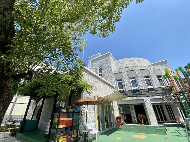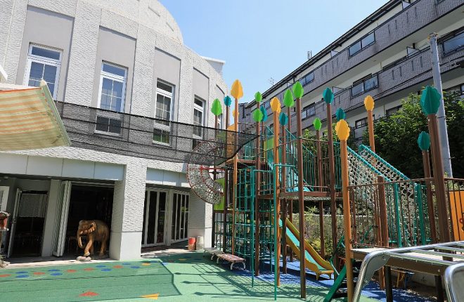 園内に入ると、保育園とは思えないモダンな建物が。まるで美術館のようなたたずまい。そしてカラフルな遊戯具が出迎えてくれました。