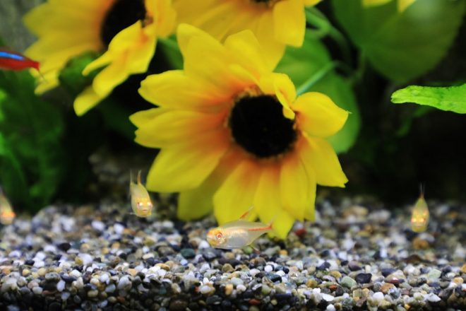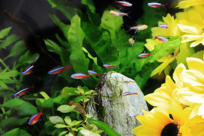 さて一体どんな魚がいるのでしょう。カージナルテトラやサイヤミーズフライングフォックス、アルビノグローライトテトラ、グラミー、ベタなどのほか、赤い個体が印象的なサンタクロースソードテールも。