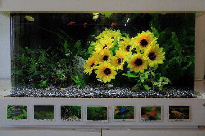 そして玄関を入ると。ありました、ひまわり畑のような夏らしい水槽が。取材に伺ったのは残暑の厳しい一日でしたが、季節感を考慮して毎月四季折々の演出が施されています。