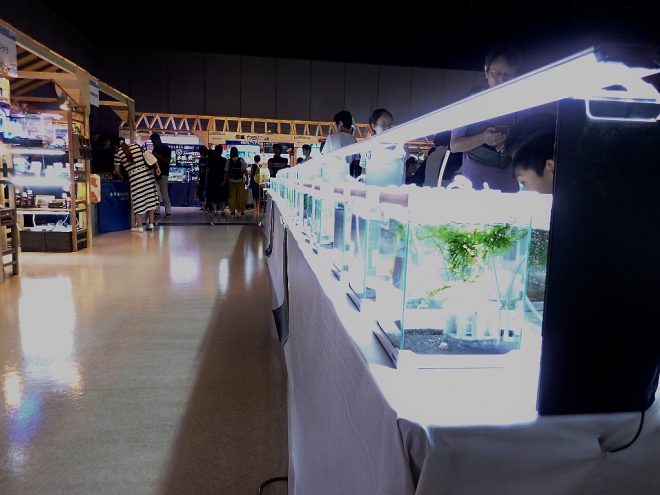 室内ブースでは、展示や各種コンテストが行われていて、メダカやビーシュリンプの姿も。どの生体もこぢんまりと美しく、見応え満点でした。特に生体を追いかける子どもたちの目がキラキラ輝いていて、とっても印象的でした。これを機に、アクアリストを目指してくれるといいんですが(笑)