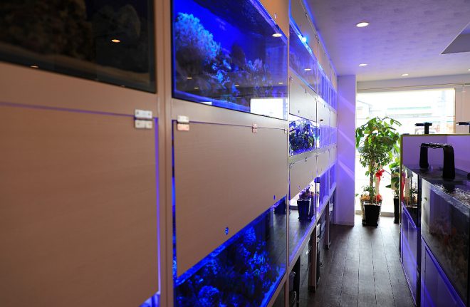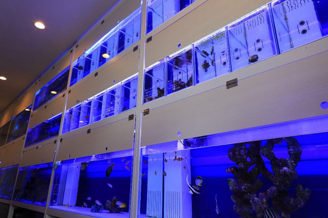 海水魚の扱いが6割を占めています。アクアショップとしては、海水魚の比率がやや高い気がしますが、「アクアはとにかくキレイで華やかでないと。お客様にそう感じてもらうには、海水魚がイメージにぴったりなんです」と、独自の世界観を展開します。