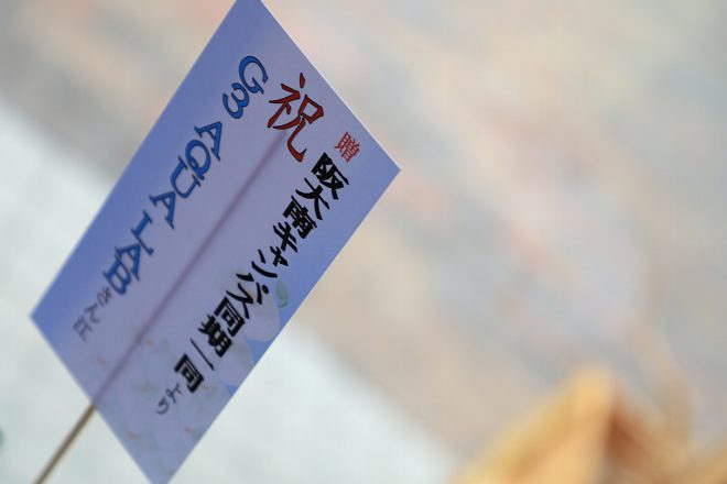 店内にはお祝いの品々があちこちに。こちらは出身校からのお祝い。なるほど、阪南大ということは、昔からこの地域を知り尽くしておられるのでしょう。