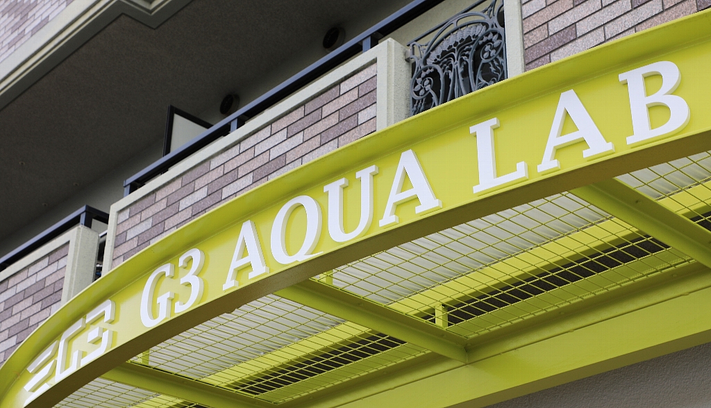 ん?お店の名前、どういう意味なんでしょう。「ジースリー アクアラボ」。読み方はわかるのですが、“G3”という部分が謎です(笑)
