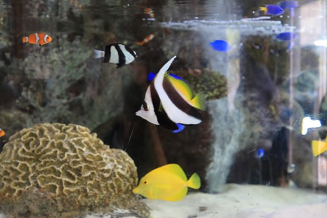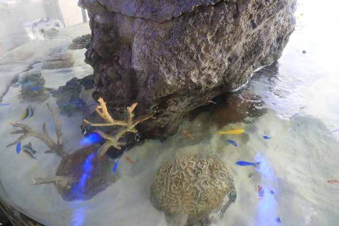 玄関ロビーには「ふれあい水槽」が。よくみると、エンゼルフィッシュやカクレクマノミなど、子どもたちに人気の海水魚が泳いでいました。