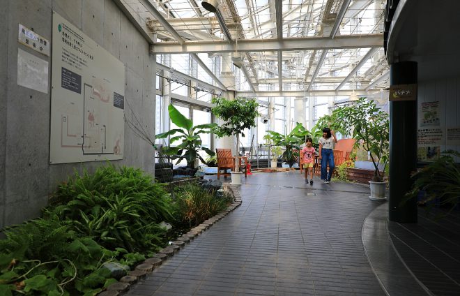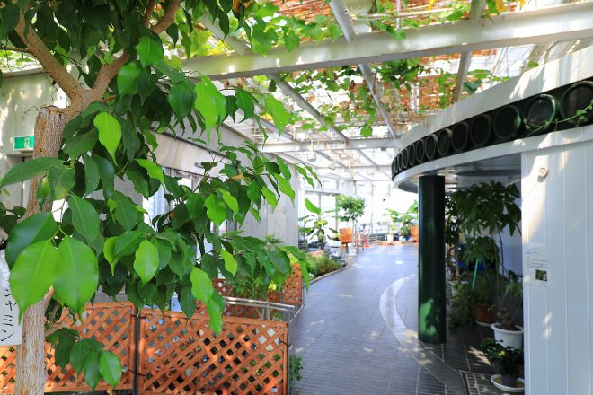 エレベーターで最上階の6階へ。ここは恒温植物園。近隣の海老江下水処理場で高度処理された水と熱が、効率よく利用されているのだそう。水耕栽培によって育てられている植物や小さなせせらぎもあったりして、来場者にとってはちょっとしたオアシスとなっています。単に下水処理だけでなく、自然環境保全にもひと役買っていることがわかります。