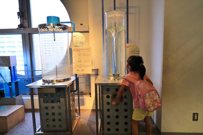5階からは、子どもたちが体験しながら学べる展示物がたくさん。空気の流れによって水がどんな影響を受けるか、目でみてわかる水槽。