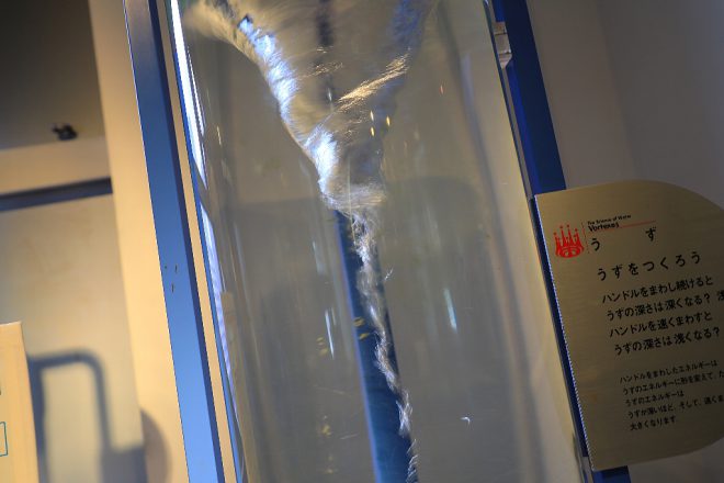 力いっぱいハンドルを回すと渦が発生したり、表面張力を体感できる実験的な展示物が並びます。水に力を加えるとどうなるか、水とはどういう性質ものなのかなど、水の原理を学ぶための基本編といったところでしょうか。