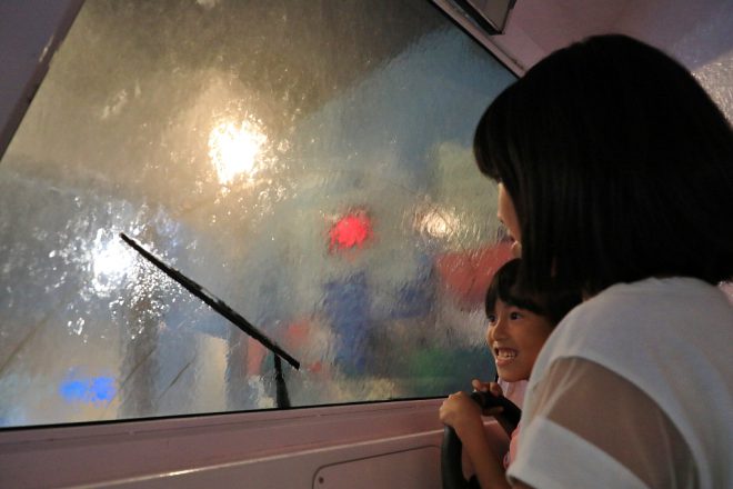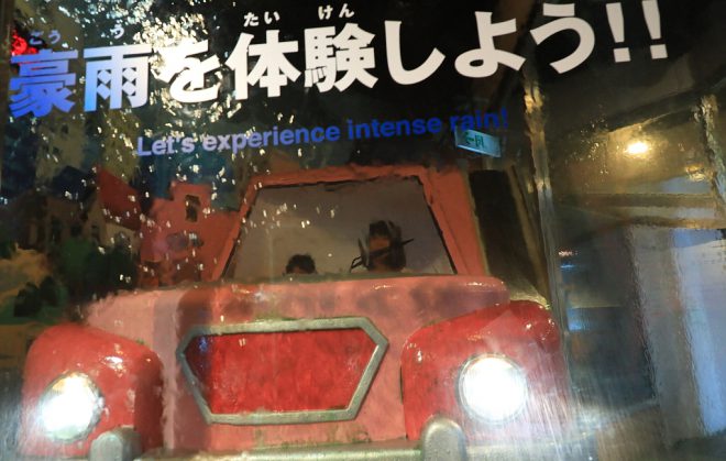 もし車で移動中に100㎜の豪雨に遭遇したらどうなるか。そんな体験コーナーもありました。もちろん前はほとんど見えないし、ワイパーの効果もほとんどありません。もし実際にこんな豪雨に遭遇したら、浸水して車外に出られない危険性だってあります。生活にうるおいをもたらす水も、時としては牙を向く可能性があることを示唆した展示でした。