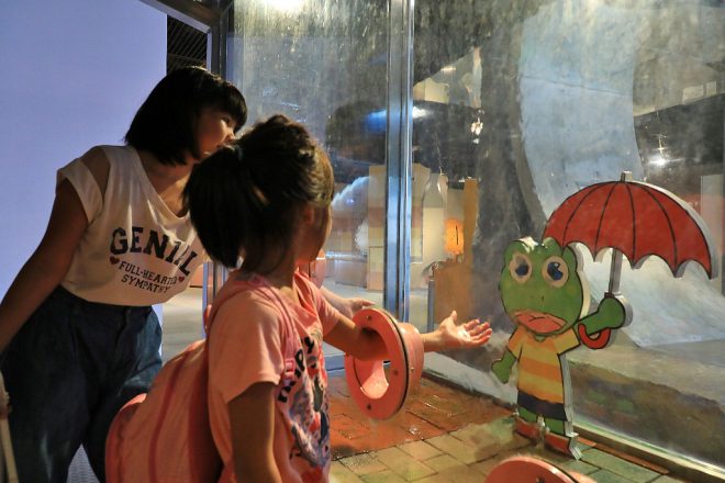 子どもだけでなく、大人たちにも一番人気のあるコーナーがこれ。豪雨体験。手を差し入れて、しばらくすると大雨がザーッと。最大毎秒100㎜の雨量を身近に体験できます。「うわ~、めっちゃ濡れた~!」。そらそうや~(笑)。思った以上に雨量が多いのに驚かされます。