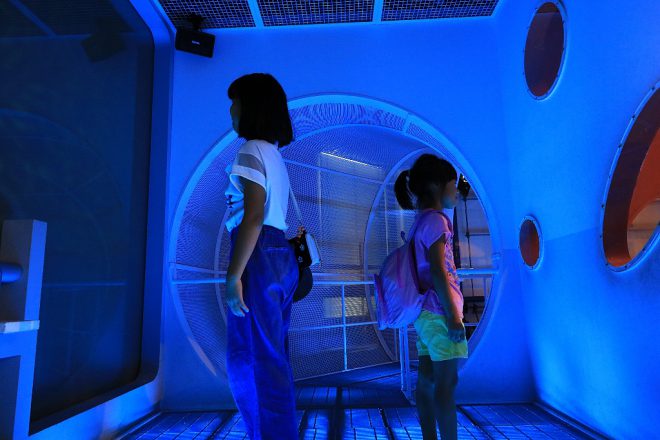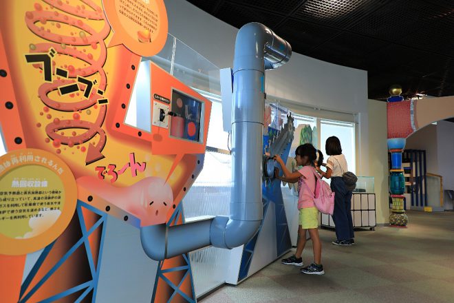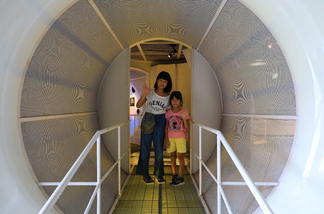 ここからは4階。英美里ちゃんや亜里紗ちゃんにとって、一番お気に入りの展示ゾーンだそう。これはまるで宇宙船!トイレや台所の生活排水がどのような仕組みで高度処理されているかをアピールしています。