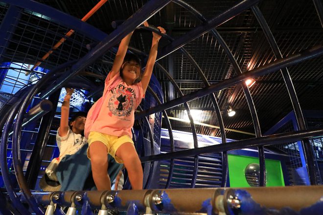 2人の話によると、地下1階にあるジャングルジムから伝ってゆくと、さっきのカプセルにたどり着くのだそうです。勝手知ったるなんとやら(笑)。なるほど、来館はもう10回以上なのだとか。妹に対する面倒見がとてもよくて、2人だけで来場することもしばしば。そういえば、入場無料というのも魅力です。