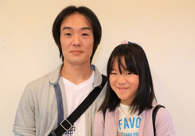 狂言師・野村萬斎をマイルドしたような雰囲気の伊賀市在住・廣岡 剛さん親子。次女の柚月ちゃん(小4)と来場しました。「ぜひ娘にも魚に興味を持ってもらいたくて」と、あらあらいきなり下心丸出し(笑)。とはいえ、子どものころからの経験は絶対大事。柚月ちゃんも「魚は大好き!」と、何という親孝行な優等生発言(笑)。自宅には水槽が20個以上もあり、グッピー以外にベタやネオンテトラ、スネークヘッドなど多々。しかも「魚は全部パパの部屋にいるから、部屋に行かないと見れないの」と柚月ちゃん。あまりにも大人げないパパの作戦、大成功の巻でした(笑)!
