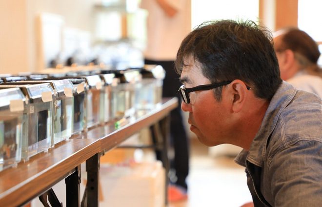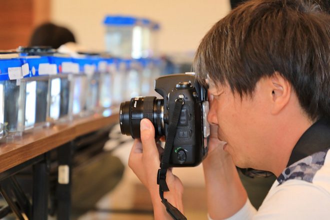 いきなりグッピーの大御所登場。真剣なまなざしで出品魚を審査中の京都府在住の中村信男さん。泣く子も黙るグッピー愛好家(笑)。数えきれないほどの受賞歴を持ち、まさにグッピーの歴史は中村さんの歴史でもあります。お会いするのは今回が2回目で、「その節はお世話になりました!」と、何度聞いても忘れられないドスの利いた声(笑)。八百屋さんが本職ですが、声だけ聞いてたら魚河岸でセリをしていてもおかしくない男っぽさを感じます。「いやいや、もう私らの時代ではあきませんねん。これから若い人たちに活躍してもらうためには、どんなことでもやりますよ」。ノウハウも知識も、すべて若い人たちに託していきたいという熱い思いは人一倍。そのためなら労苦を惜しまない、とも。「ノウハウ?なんぼでも持っていってくれはったらよろしいやん(笑)」と、大御所らしからぬ人懐こいキャラクターも印象的でした。