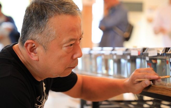 出品魚をじっくり見るには、ちょうどいい人数。少なすぎて閑散とすることはなく、かといって多すぎて息が詰まることもなく。あちこちで会話も弾み、いい雰囲気になってきました。やっぱり居心地のいい会場です。