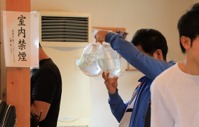 コンテストとは別に、販売用の魚を約20袋用意。グッピー愛好者ががブリードしたオリジナルのグッピーがリーズナブル価格で買えるのがうれしいですね。