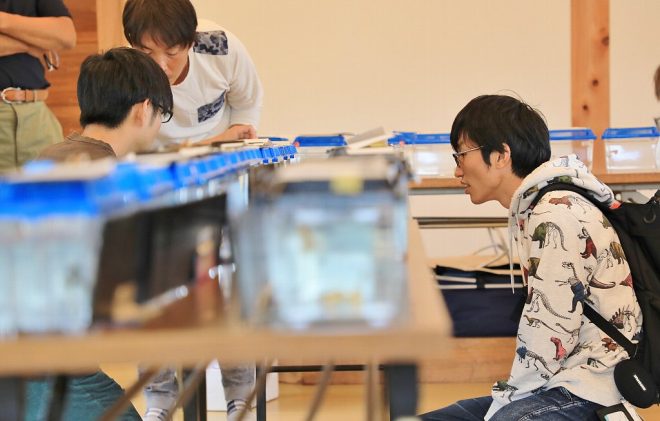 大御所に8時間も運転させておきながら、末永さんを師と仰ぐ若いもん2人(笑)。姫路GUPPY倶楽部・大谷会長と話をしているのは、大分グッピーファンクラブのメンツ。ただのメンツではないんです。登録者数7,000人以上もいるという動画界でも有名なユーチューバーなのです。もちろん内容は、グッピーに関することすべて。時代は変わったものです。ひと昔前なら、自分のノウハウを人に教えることはさほどなかったのですが、今はSNSなどを使って気軽に情報発信できる時代。「好きな趣味を楽しむのに、年齢はありませんから!」と力強いコメント。野球少年がプロ野球選手に憧れるように末永さんを慕っている2人。そこまで言うなら、帰りくらいは運転してあげてくださいね(笑)