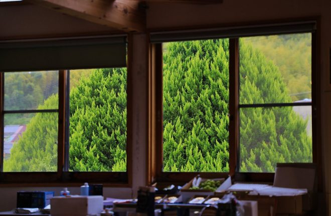 2階へ上がると、おお~やっぱりログハウス風。じわりとしみ入る木のぬくもり。周囲の自然環境と合わさって居心地よすぎます。ふだんの取材現場に比べるとかなりのアドバンテージとなりました(笑)