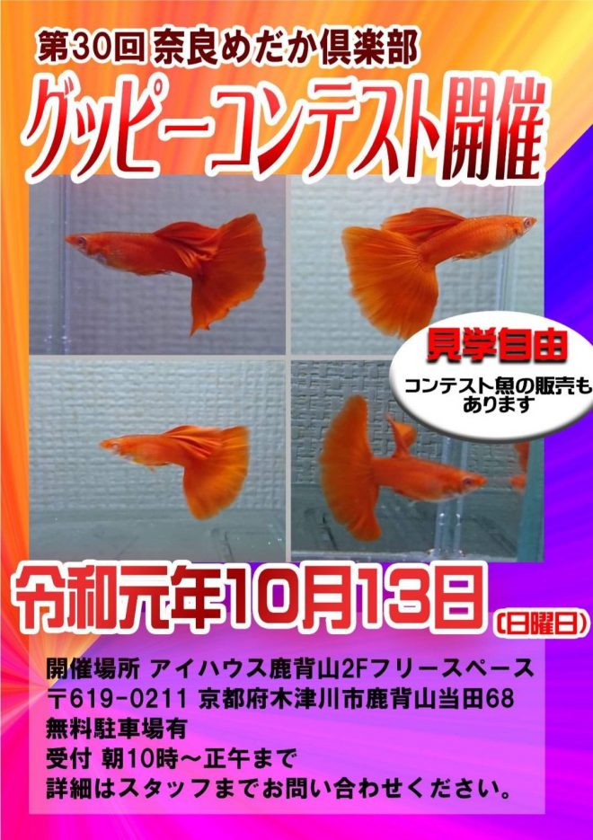 主催は奈良めだか倶楽部。これは例年通り。「ん?グッピーのコンテストなのに、めだか?」。まあまあ細かいことは抜きにして(笑)。初代会長がかつて奈良県でアクアショップのオーナーだったころからの愛称。ある意味愛着も。なので、誰もそんなこと気にしてません(笑)