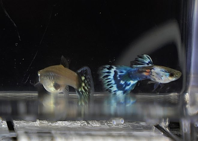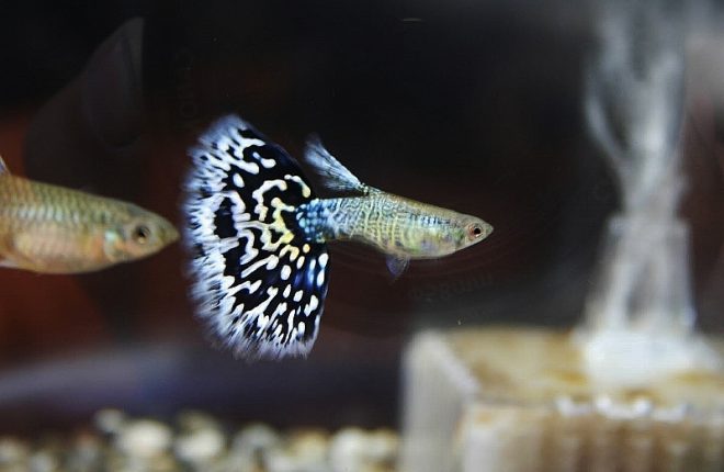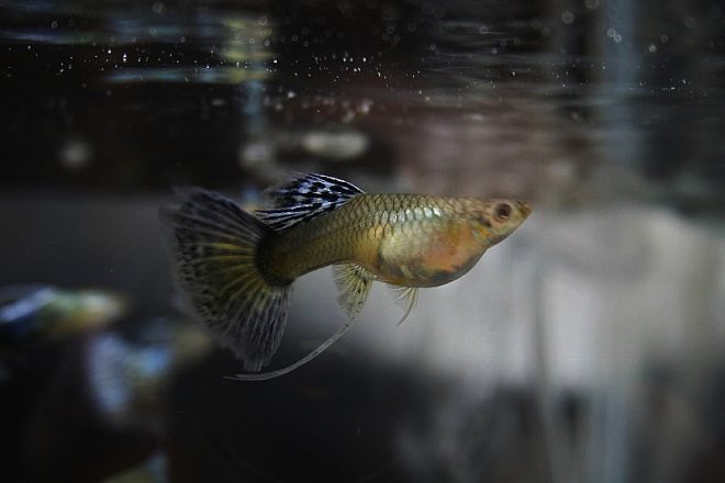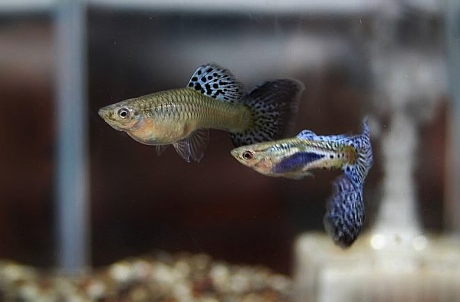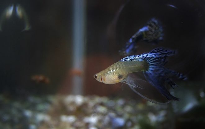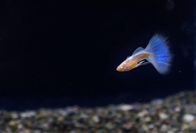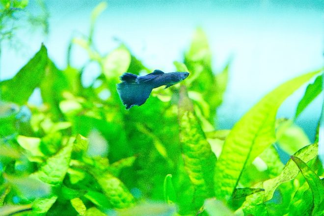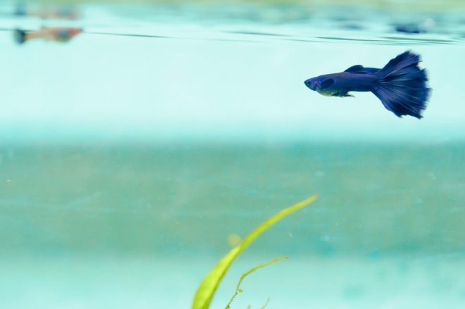 ゆうゆうと泳ぐモスコーブルーのオス。ついつい時間が経つのも忘れて見入ってしまいます。やっぱり思い切ってグッピーをお迎えしてよかった!ところが、直後にメスのお腹が小さくなっていたことに気づきました。1カ月後には稚魚が産まれると聞いていたので、きっとエサの量の違いで痩せたんだと思っていたのですが、どうやらこのタイミングで産み終わっていたみたいです。出産のタイミングがわからなかったことは残念でしたが、その後1匹、また1匹と稚魚が確認できて、全部で3匹。わが家に来てから、3週間目には親魚の食事の邪魔をするくらいのサイズにまで成長してくれました(笑)。その後もポロポロと水槽内で産まれ、産卵箱での仔産もうまくいきました。