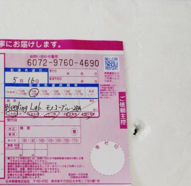 発送された時点で、発送連絡とともに送付書まで写メして送ってくださいました。加えて、夜間の冷え込みに備えて使い捨てカイロを貼って発送しました、とも。さらには、酸素を取り込むための空気穴を荷物に開けています、との心憎い説明もありました。いよいよ国産グッピーがわが家にやってくる!あとは無事に到着するのを待つだけでした。